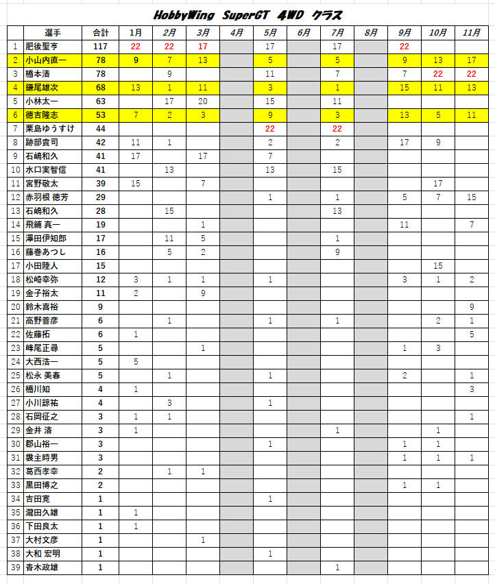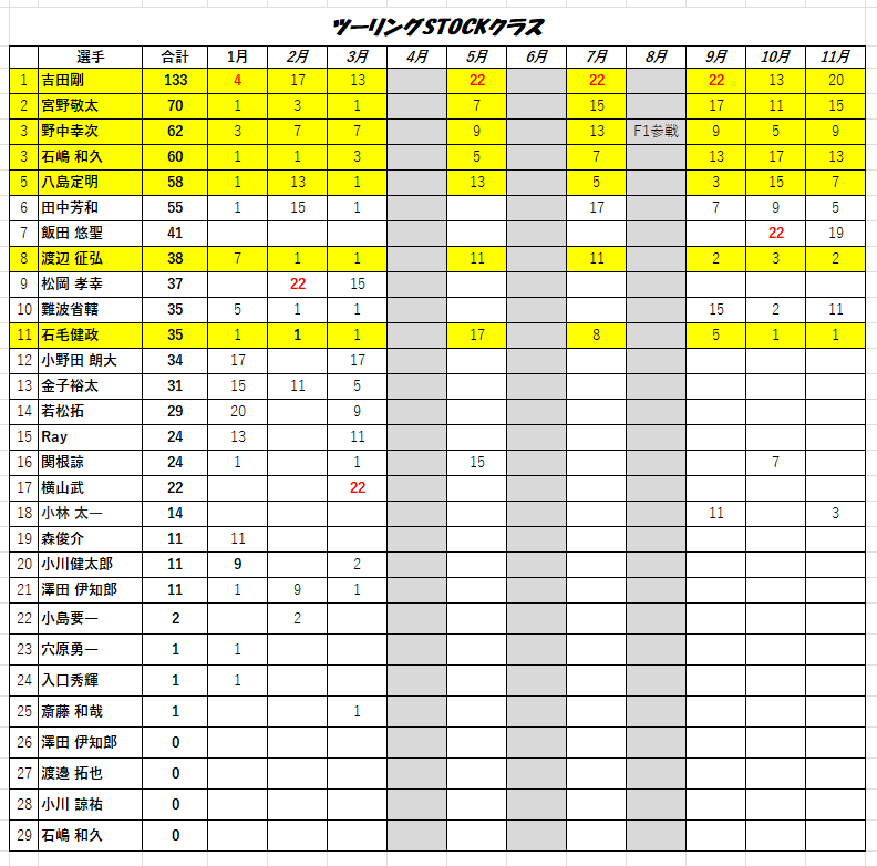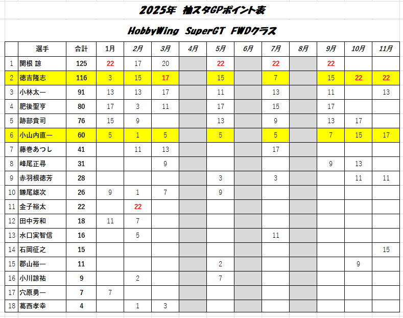 2025年12月14日 袖スタGP 2025年 ポイントランキング コメント数:0 コメント カテゴリ:レース情報 by rush_ishioka 袖スタGP 2025 シリーズポイントランキング表です~*急いで作成したので、誤記等あるかもしれません(汗 ご指摘はメッセージor店頭で教えてください~*黄色で塗りつぶされた方は、2025年皆勤賞の方です 6月に開催した袖スタGP ポイント対象外となります<SuperGT FWDクラス><SuperGT 4WDクラス><ツーリングSTOCKクラス><F1ナロークラス>*2025年度の表彰は、2026年開幕戦(1月11日)に行います~